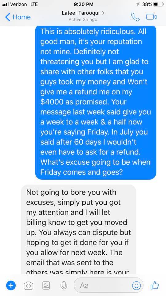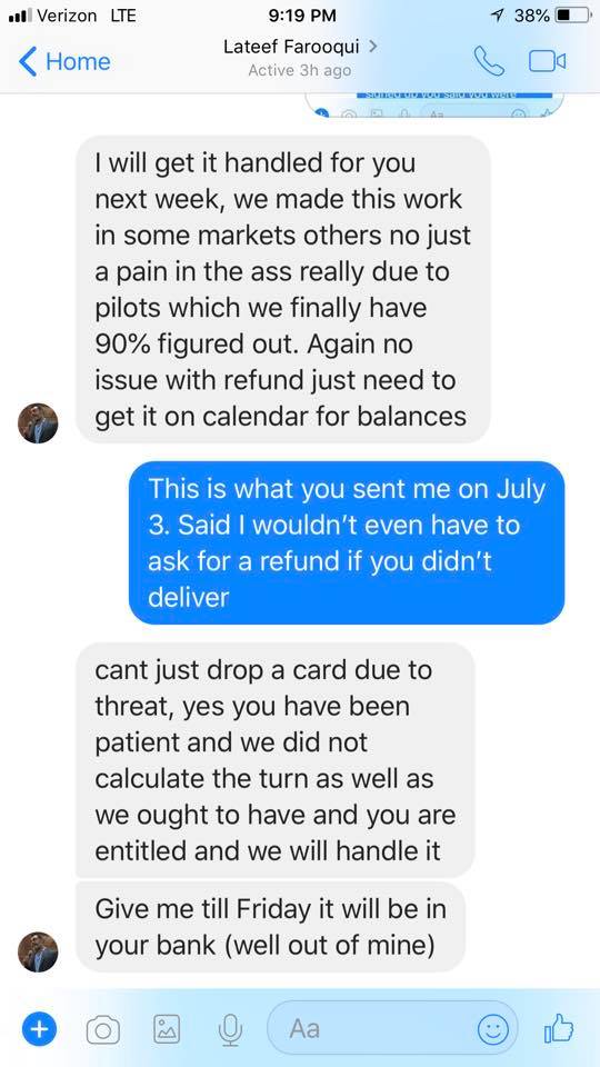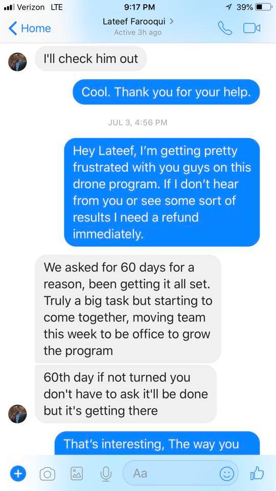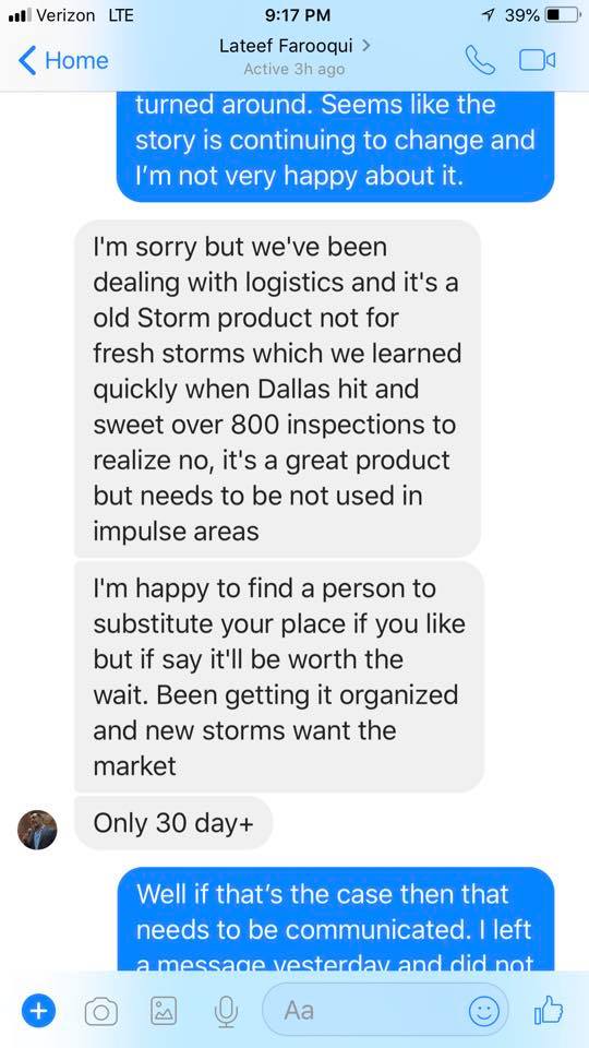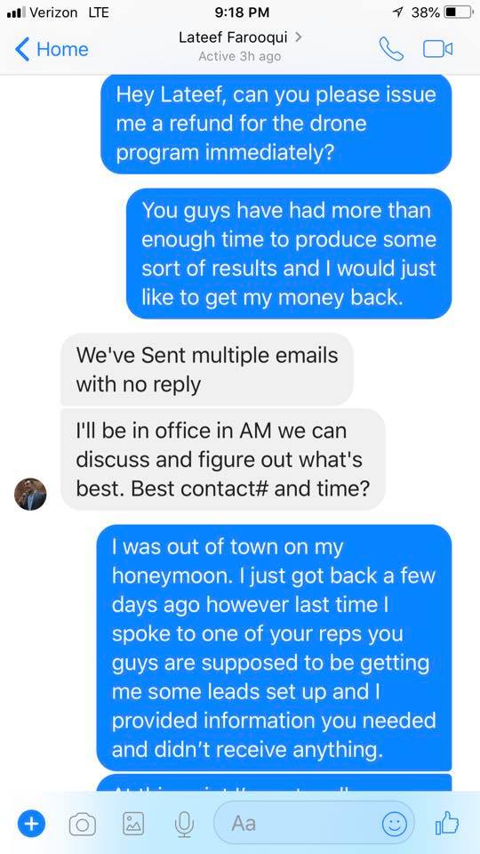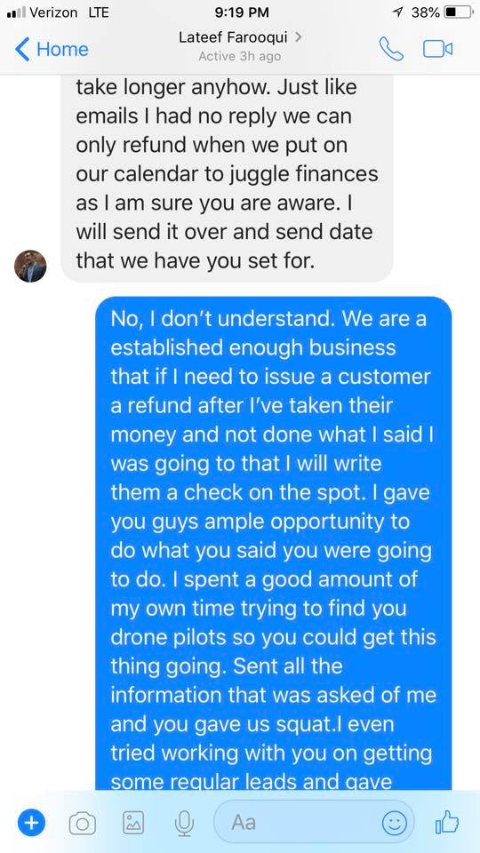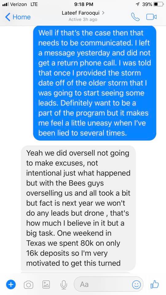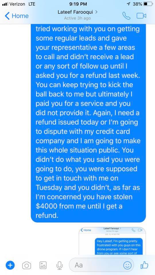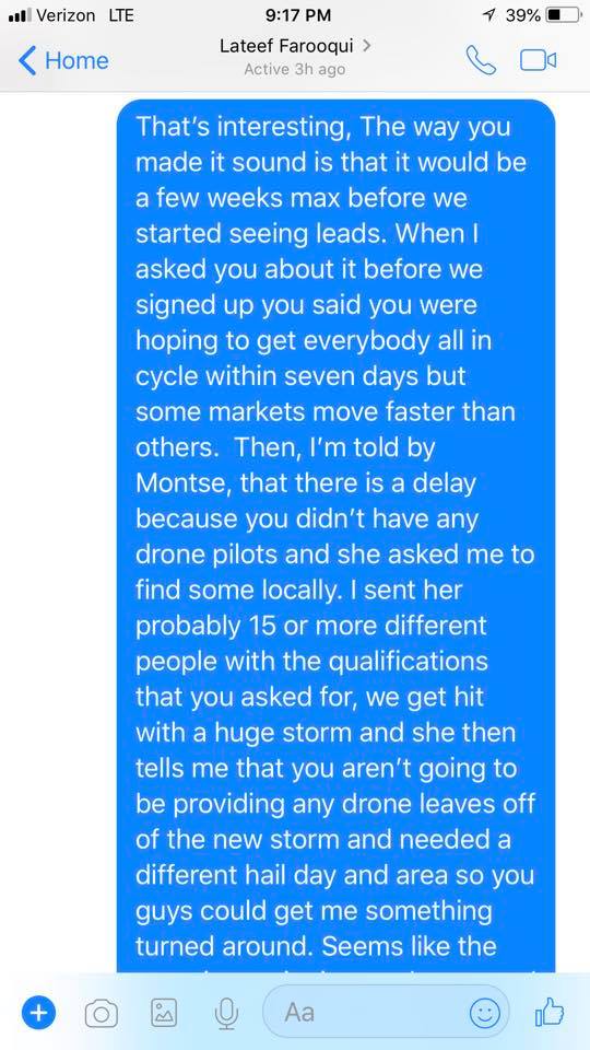 SCAM ALERT!!! Who here has been ripped off by Qualified Storm Leads? I signed up for their drone program 4 1/2 months ago & gave them $4000 as a deposit and have literally gotten nothing but excuses as to why I haven’t gotten any leads. Once I asked for a refund which was promised after 60 days if they didn’t provide anything. I’ve had to ask for a refund multiple times and it’s always some sort of delay. Here’s the conversation of me clearly trying to work this out with them. This guys nothing but a scam artist as far as I’m concerned. Read through the conversation and you be the judge. I strongly advise that nobody in this group gives this guy a dime!